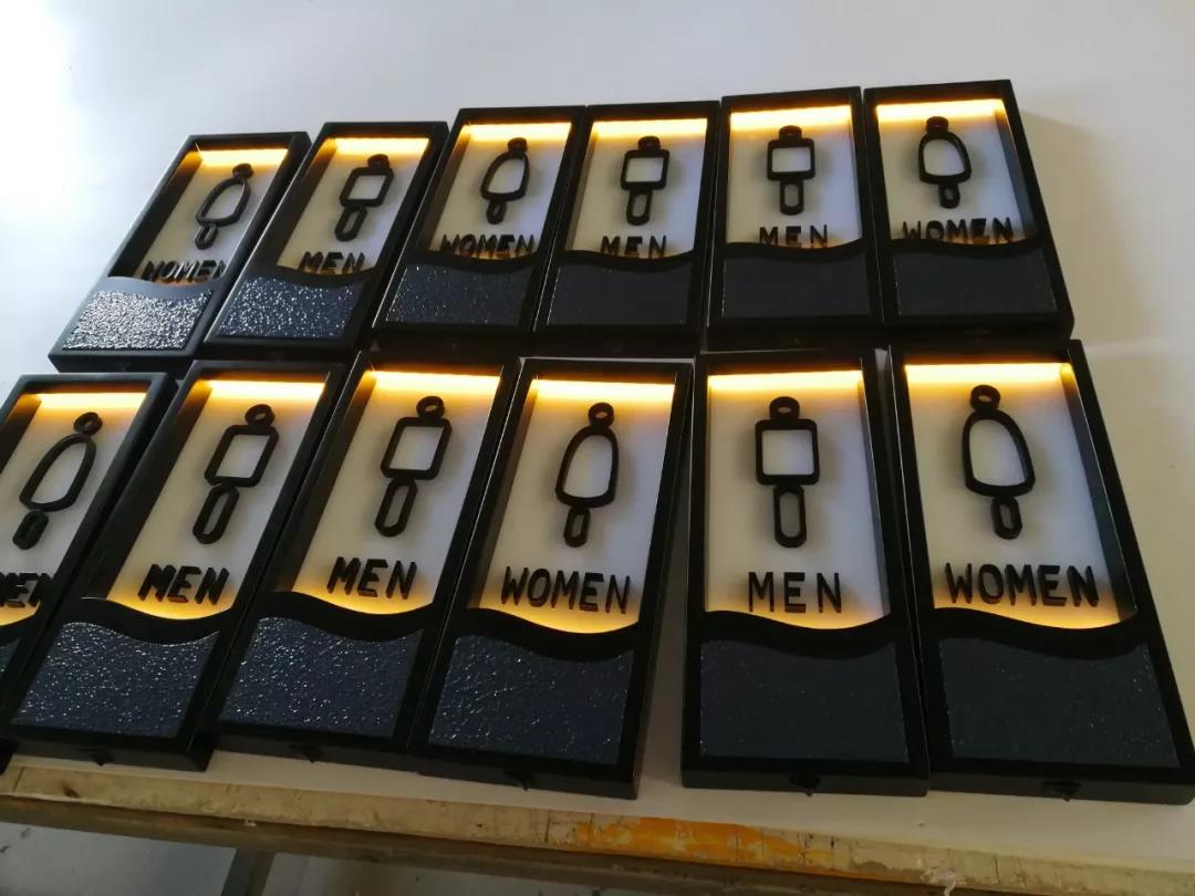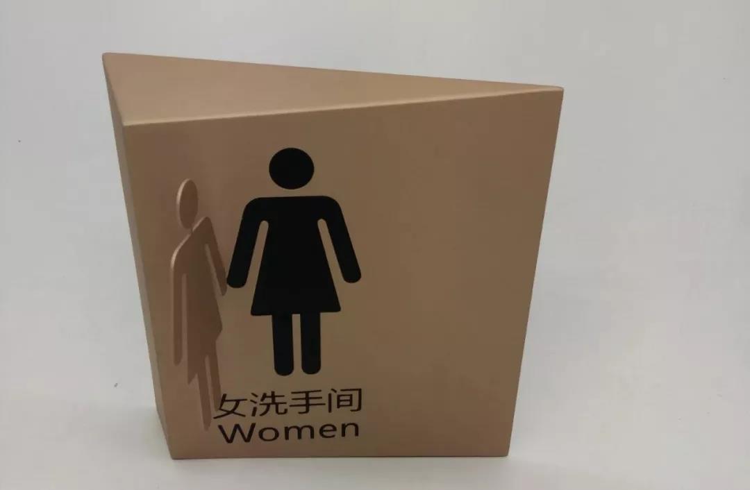 这款标识牌应客户要求,材料主要选用不锈钢。1mm不锈钢镂空切割折弯焊接成型,烤漆。且蓝色部分采用对工人师傅技术比较考究的金属漆。厕所图标轮廓较小,所以采用亚克力雕刻。